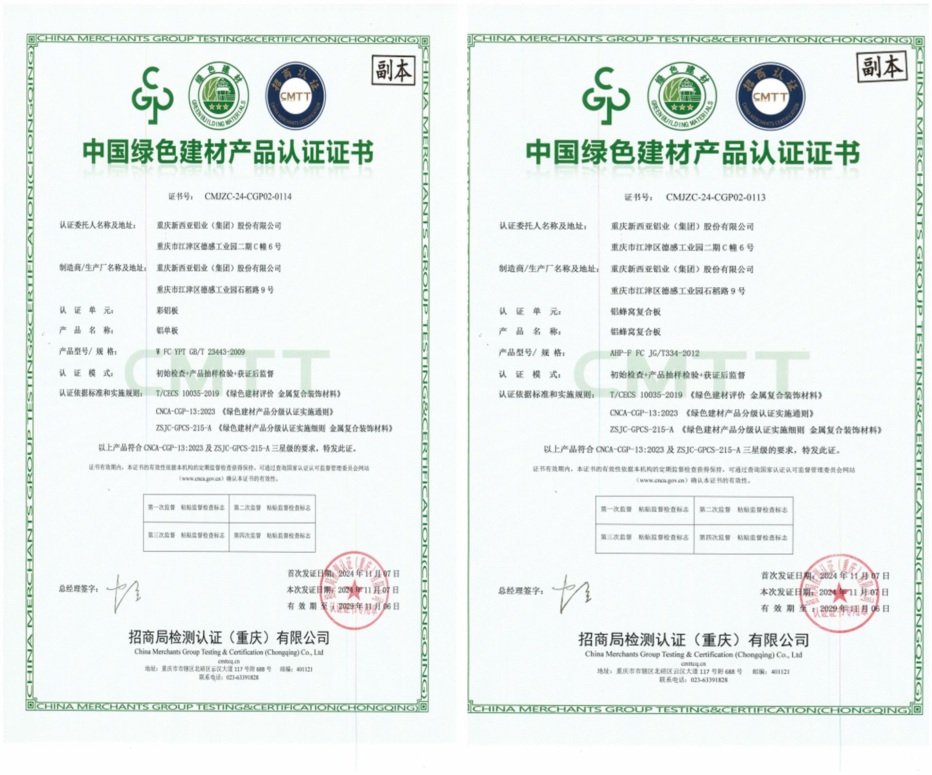 近日,重庆新西亚铝业集团的铝单板、铝蜂窝复合板两项产品顺利通过认证审核,获得国家绿色建材评价标识最高等级——“三星级中国绿色建材产品认证”!