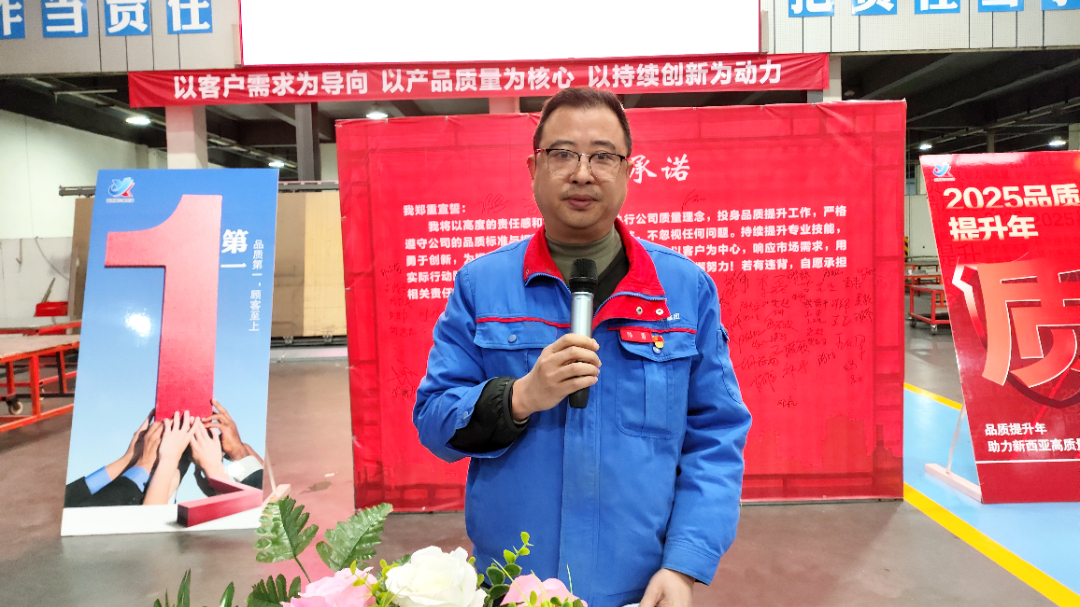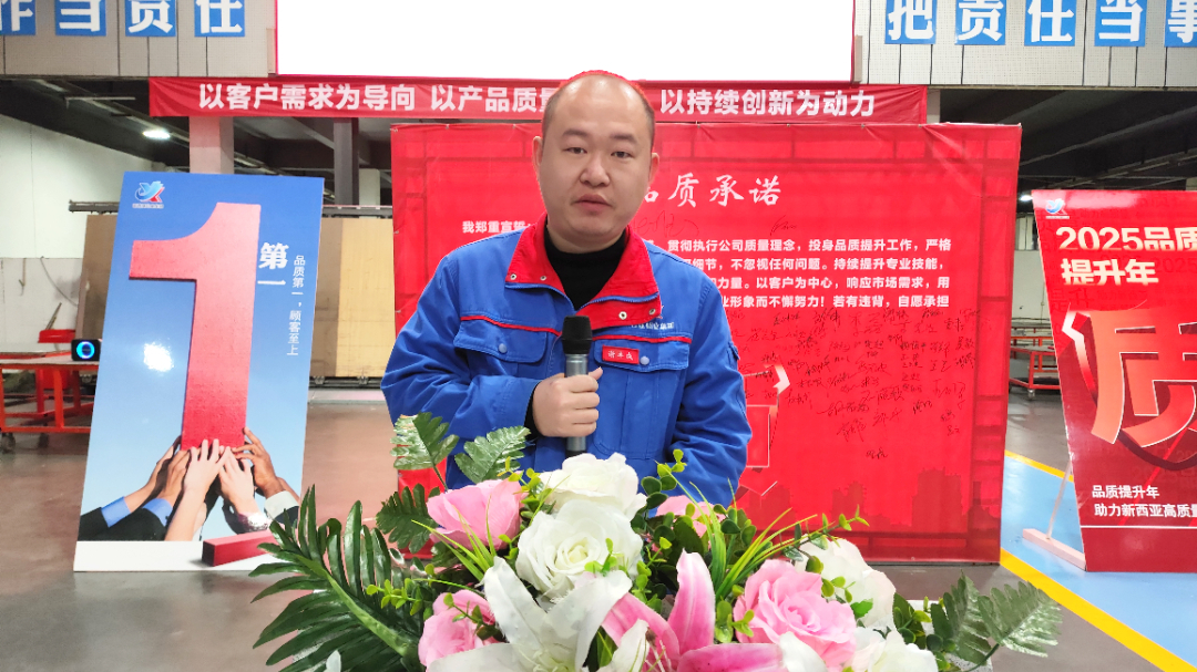 董事长兼总经理刘斌在会上发表了重要讲话。他首先介绍了新西亚“品质提升年”的核心内容,包括质量工作的关键板块、品质提升的具体范围、公司的质量理念以及质量管理工作小组的职能职责等。