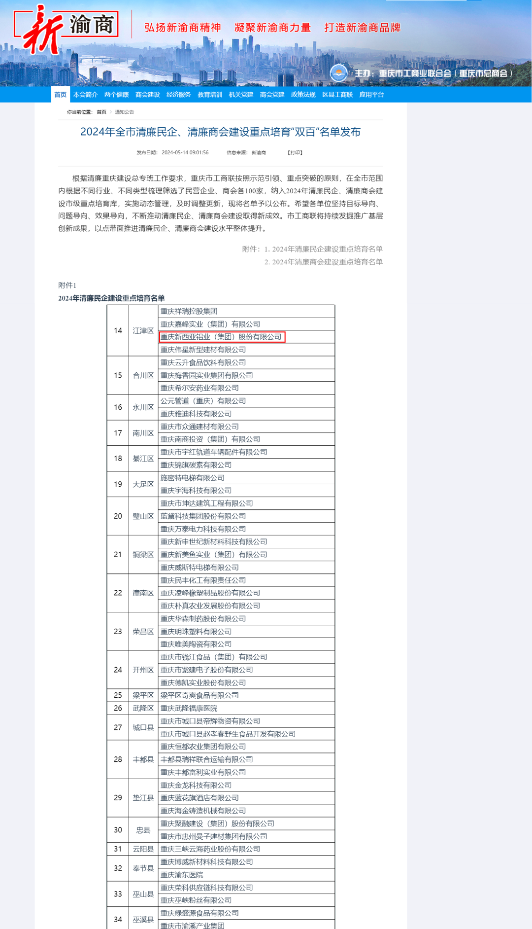 推动清廉重庆建设,是深入贯彻习近平新时代中国特色社会主义思想和习近平总书记视察重庆重要讲话重要指示精神的具体举措。4月22日,重庆市工商联发布了《关于2025年清廉民企、清廉商会建设重点培育“双百”名单的通报》。新西亚铝业集团凭借在清廉建设方面的突出表现和显著成效,继2024年荣膺榜单之后,再次成功入榜2025年清廉民企建设重点培育“双百”名单。