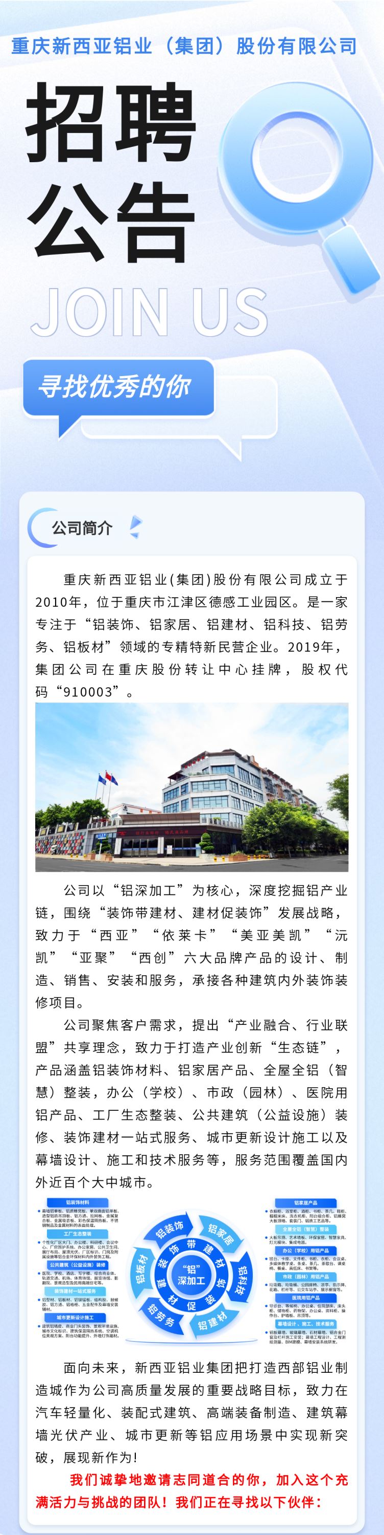 重庆新西亚铝业(集团)股份有限公司:招聘公告