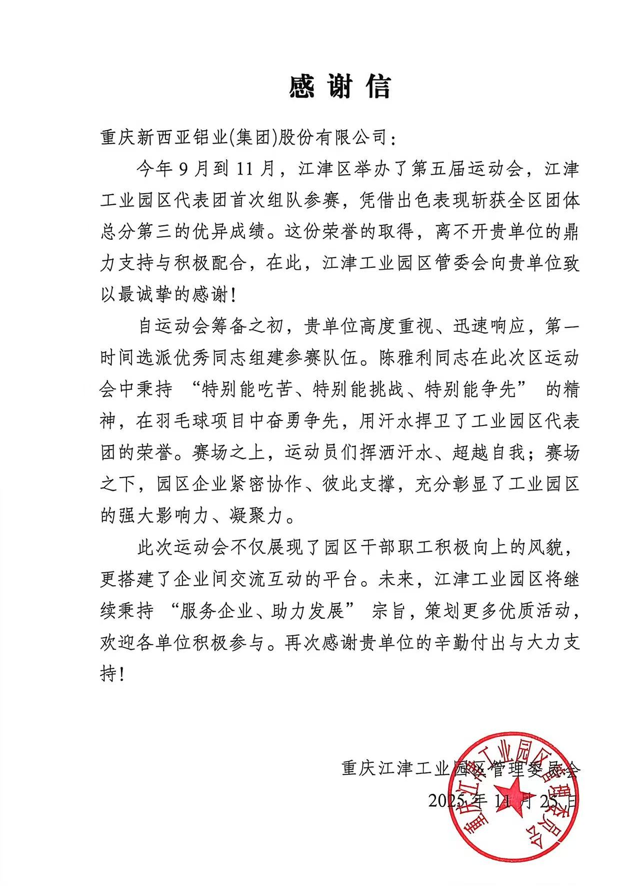 近日,一份来自重庆江津工业园区管理委员会的感谢信,让新西亚铝业全体同仁倍感振奋。信中,园区管委会对我司财务管理部陈雅利同志在第五届区运会中的卓越表现给予了高度赞扬,并对我司的大力支持表示诚挚感谢。