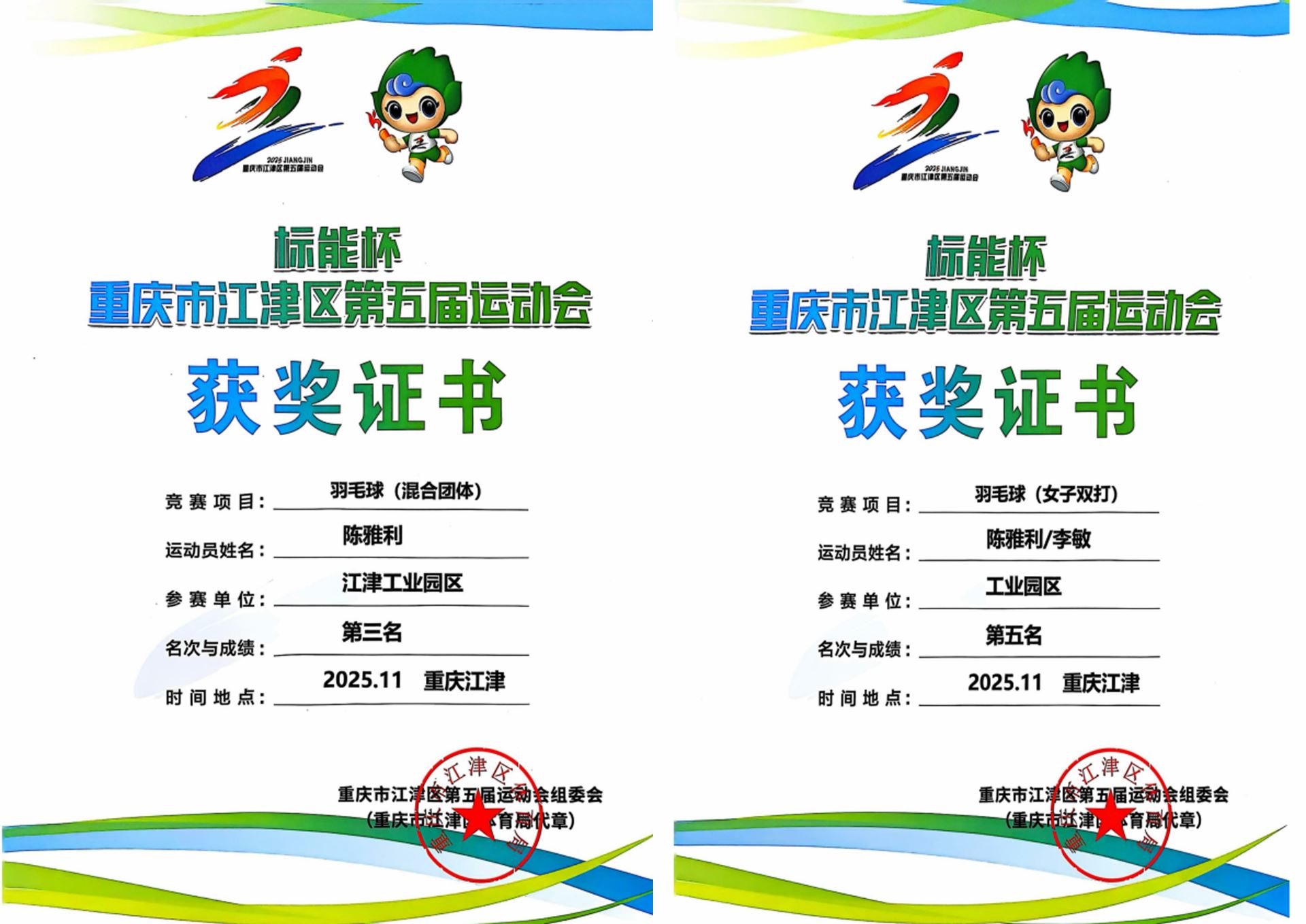 这份荣誉的背后,是历时两个月的激烈角逐。在9月至11月举行的江津区第五届“标能杯”运动会中,陈雅利同志作为工业园区代表团的一员,与队友并肩作战。她秉持着“特别能吃苦、特别能挑战、特别能争先”的拼搏精神,一路过关斩将,最终获得羽毛球混合团体第三名、女子双打第五名的成绩,为工业园区代表团赢得全区团体总分第三名的优异成绩贡献了自己的一份力量。