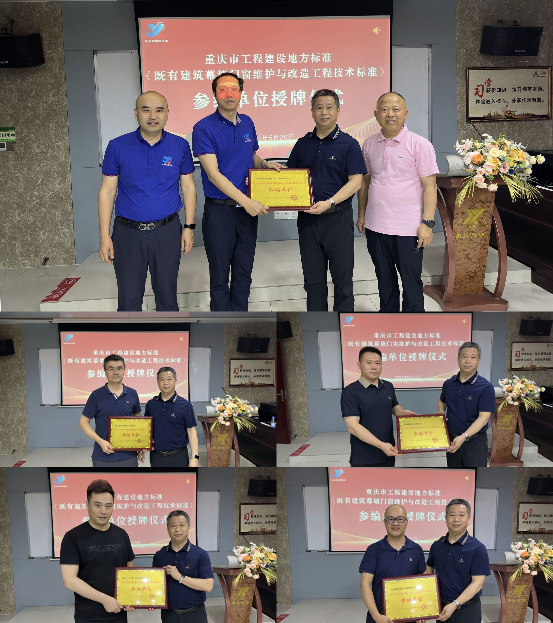 紧接着,重庆市《既有建筑幕墙门窗维护与改造工程技术标准》编制组负责人刘建、王勤向新西亚铝业、重庆西南铝建设工程有限责任公司、曜之岩(广州)建材科技有限公司等多家参编单位授牌。此环节标志着各参编单位将共同承担起该地方标准编制的责任。